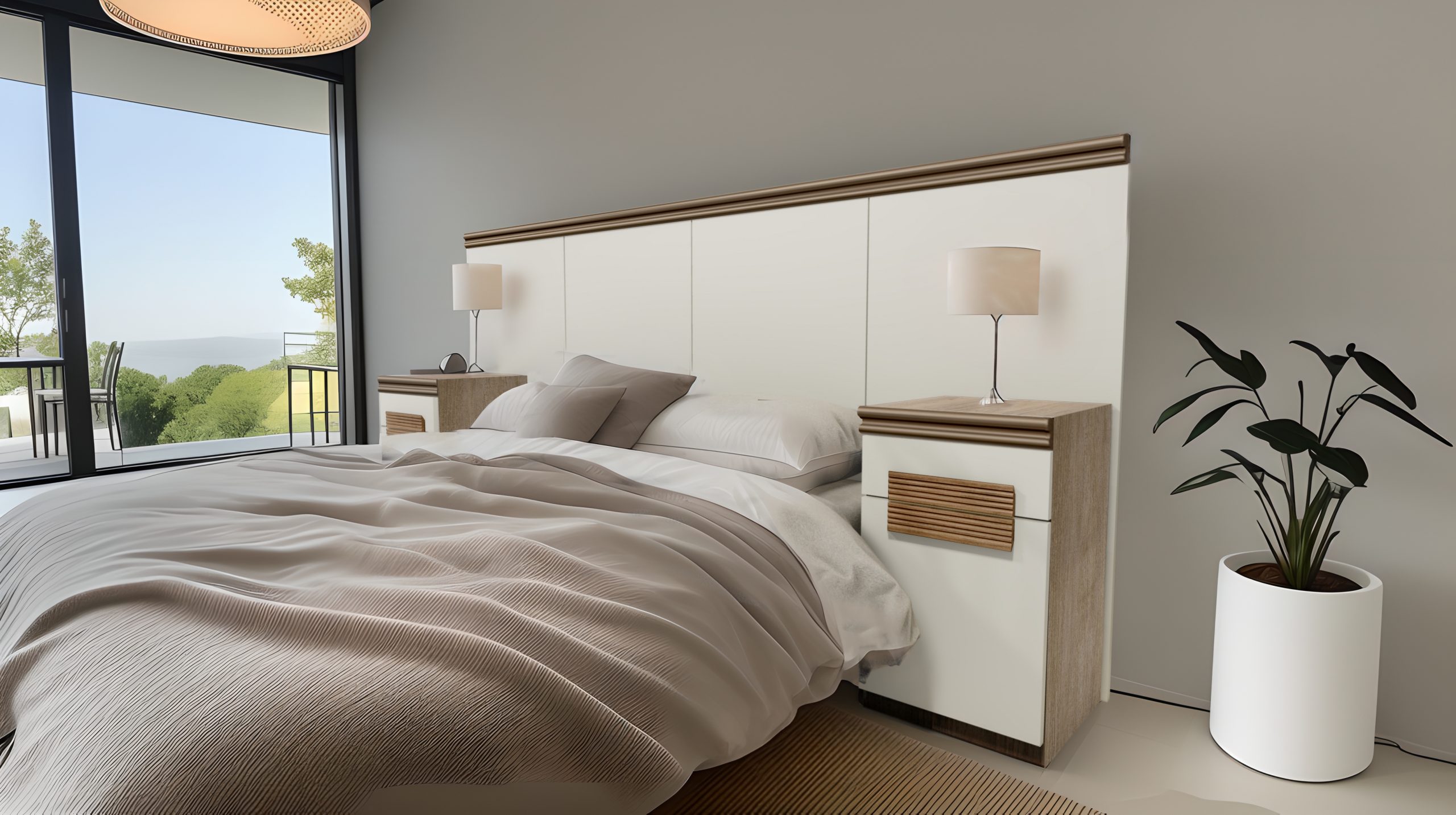 3.800 Cabecera Matrimonial con 2 Mesas de Luz – Línea Molduras – Gris – Coral